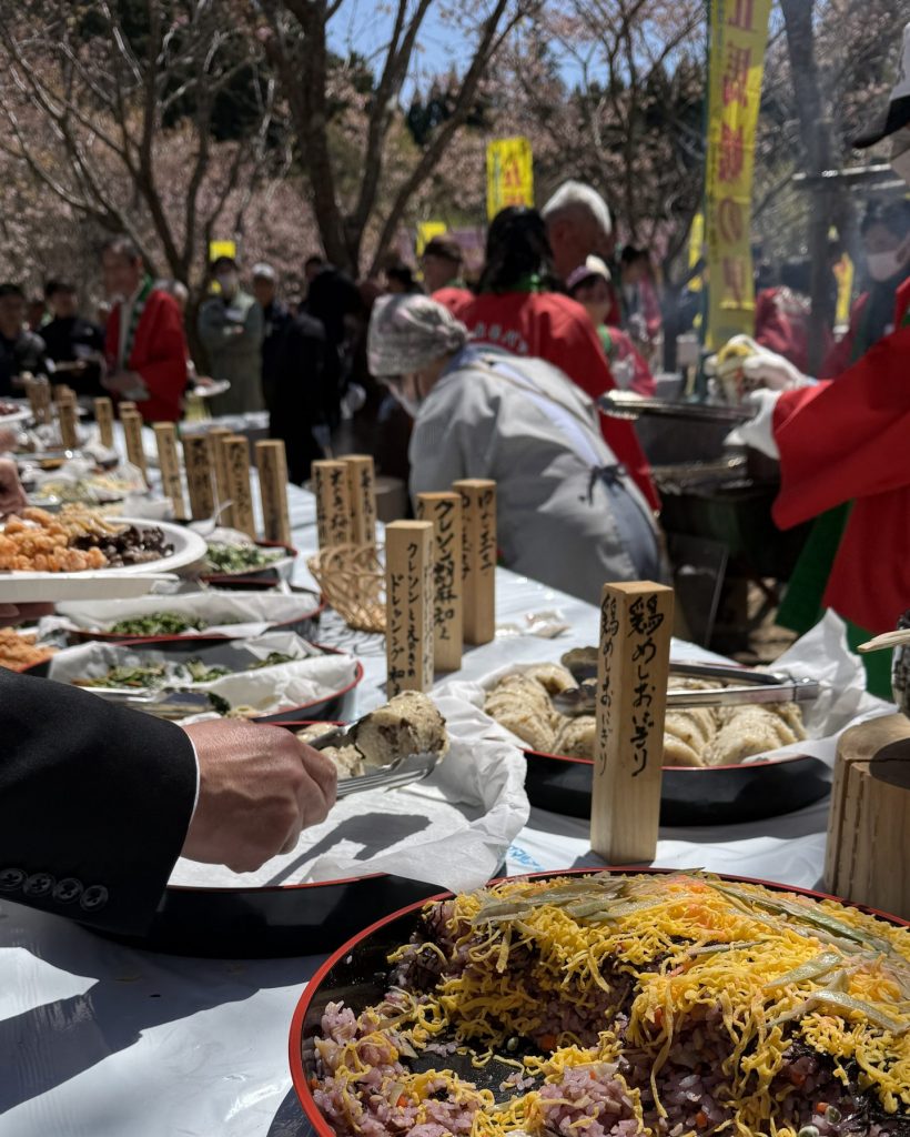 会場は日田市の五馬媛の里。やわらかな日差しの中、満開の桜がお出迎え🌸