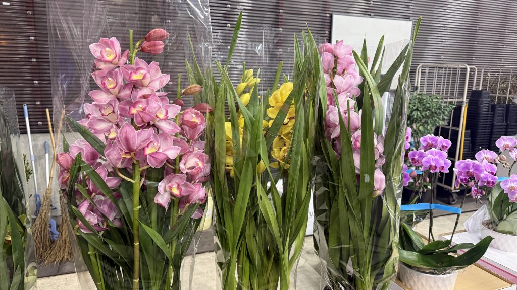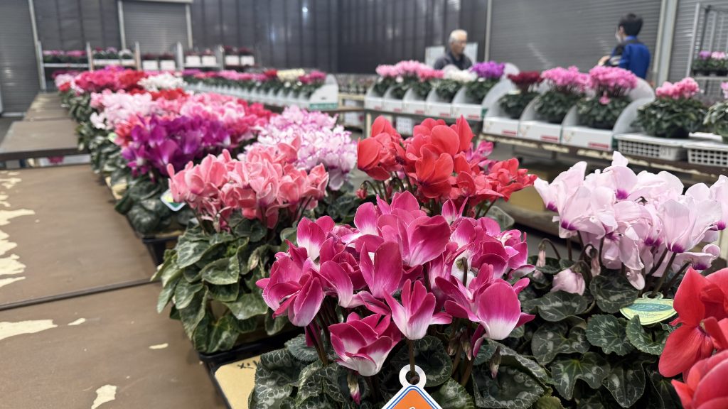 冬の花市場は、シクラメンの華やかさ、ポインセチアの季節感、シンビジウムの高級感が
